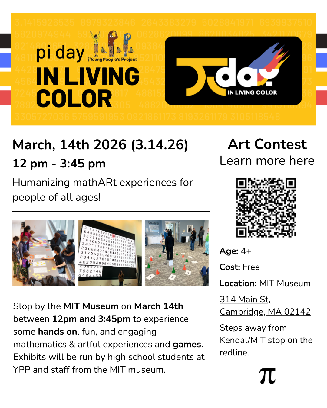 Stop by the MIT Museum on March 14th between 12pm and 3:45pm to experience some hands on, fun, and engaging mathematics & artful experiences and games. Â Exhibits will be run by high school students from YPP and staff from the MIT museum.